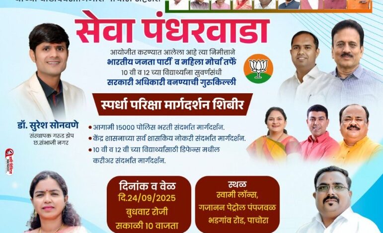 पाचोरा येथील भाजपा तर्फे 24 रोजी स्पर्धा परीक्षा मार्गदर्शन शिबिर भारताचे पंतप्रधान नरेंद्रजी मोदी यांच्या वाढदिवसानिमित्त येथील भारतीय जनता पार्टी व भाजपा महिला मोर्चा तर्फे बुधवार दिनांक 24 सप्टेंबर 2025 सकाळी 10 वाजता स्पर्धा परीक्षा मार्गदर्शन शिबिराचे आयोजन करण्यात आले आहे स्वामी लॉन्स गजानन पेट्रोल पंप शेजारी, पाचोरा येथे हे मार्गदर्शन शिबिर आयोजित केले आहे या निमित्ताने गरुड झेप अकॅडमी (छत्रपती संभाजी नगर) चे संस्थापक अध्यक्ष डॉ. सुरेश सोनवणे हे इ. 10 वी व 12 वी च्या विद्यार्थ्यांना सरकारी अधिकारी बनण्याची गुरुकिल्ली या विषयावर मार्गदर्शन करतील माजी आमदार दिलीपभाऊ वाघ युवा नेते अमोलभाऊ शिंदे मा. वैशालीताई सूर्यवंशी यांच्या मार्गदर्शनाखाली भारताचे पंतप्रधान माननीय नरेंद्रजी मोदी यांच्या वाढदिवसानिमित्त भारतीय जनता पार्टी पाचोरा तर्फे सेवा पंधरवाडा हा उपक्रम सुरू आहे. या उपक्रमाचा एक भाग म्हणून मतदार संघातील उदयोन्मुख विद्यार्थ्यांना भविष्यातील करियर घडविण्यासाठी डॉ. सुरेश सोनवणे यांचे मार्गदर्शन मोलाचे ठरणार आहे आगामी पोलीस भरती संरक्षण दलातील नोकऱ्यांची संधी तसेच केंद्र व राज्य शासनाच्या शासकीय नोकऱ्यांची तयारी कशी करावी या विषयावर डॉ. सोनवणे मार्गदर्शन करणार आहेत पाचोरा भडगाव मतदार संघातील भाजपाचे सर्व पदाधिकारी याप्रसंगी उपस्थित राहणार असून जास्तीत जास्त विद्यार्थ्यांनी या स्पर्धा परीक्षा मार्गदर्शन शिबिराचा लाभ घ्यावा असे आवाहन भा.ज.पा.चे शहराध्यक्ष दीपक माने व भा.ज.पा. महिला मोर्चा शहराध्यक्ष ज्योतीताई चौधरी यांनी केले आहे
