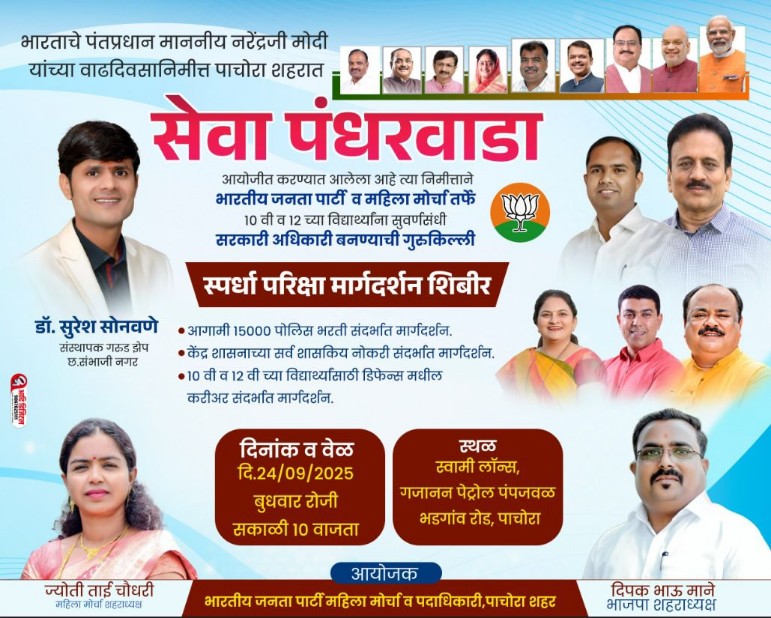 जिल्हा जळगाव तालुका पाचोरा भाजपा तर्फे 24 रोजी स्पर्धा परीक्षा मार्गदर्शन शिबिर भारताचे पंतप्रधान नरेंद्रजी मोदी यांच्या वाढ दिवसानिमित्त पाचोरा येथील भारतीय जनता पार्टी व भाजपा महिला मोर्चा तर्फे बुधवार दिनांक 24 सप्टेंबर 2025 सकाळी 10 वाजता स्पर्धा परीक्षा मार्गदर्शन शिबिराचे आयोजन करण्यात आले आहे