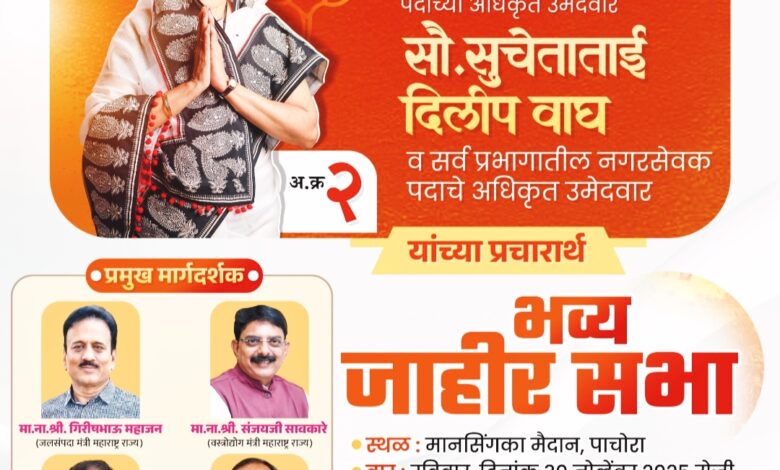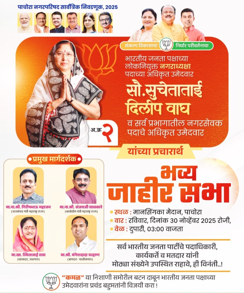 जिल्हा जळगाव तालुका पाचोरा नगरपालिका सार्वत्रिक निवडणुका 2025 रविवार दिनांक 30 नोव्हेंबर रोजी भारतीय जनता पार्टीची भव्य जाहीर सभा मानसिंगका मैदान पाचोरा सभेची वेळ दुपारी 3 वाजता सभेला प्रमुख मार्गदर्शन मा; गिरीश भाऊ महाजन जलसंपदा मंत्री महाराष्ट्र राज्य मा; संजय सावकारे वस्त्रोद्योग मंत्री महाराष्ट्र राज्य मा; स्मिताताई वाघ खासदार जिल्हा जळगाव मा; मंगेश दादा चव्हाण चाळीसगाव आमदार यांचे प्रमुख मार्गदर्शन मिळणार आहे मतदार बंधू भगिनी यांना आग्रहाची विनंती आपण सगळ्यांनी सभेला यावे आपले विनीत भारतीय जनता पक्ष पाचोरा तालुका पाचोरा जिल्हा जळगाव लोकनियुक्त नगराध्यक्ष पदाच्या अधिकृत उमेदवार सौ सुचेता ताई दिलीप वाघ व सर्व प्रभागातील नगरसेवक पदाचे अधिकृत उमेदवार यांच्या प्रचारार्थ