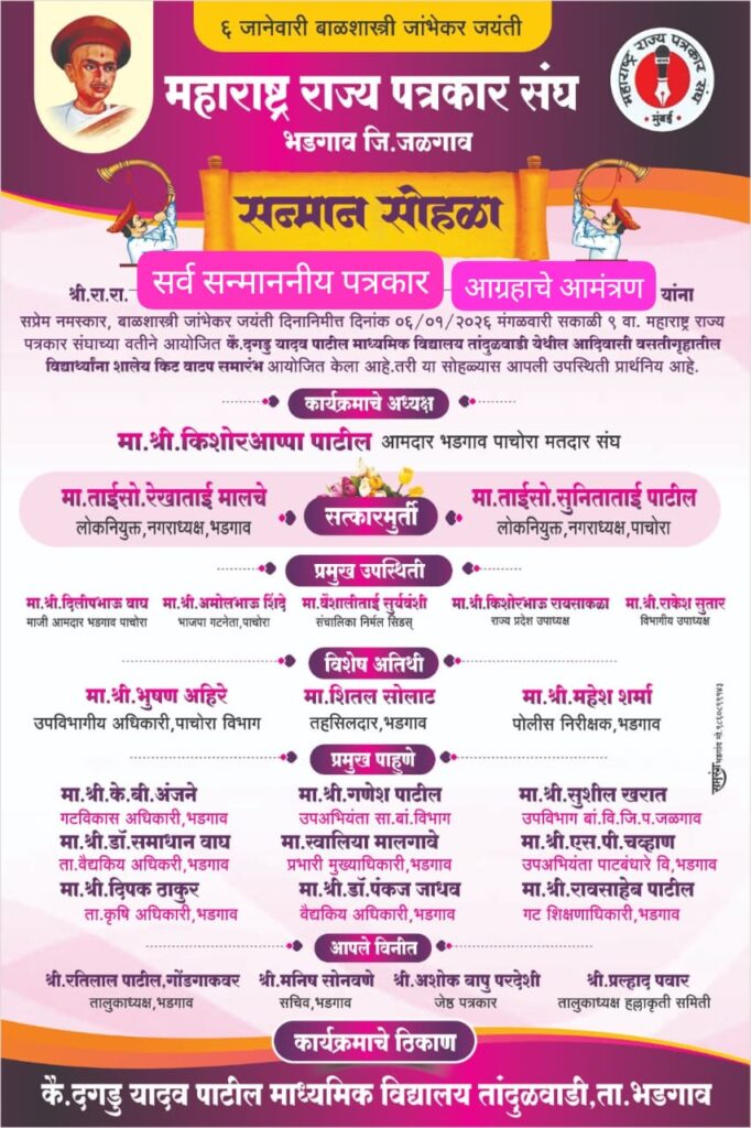 तांदुळवाडी ता.भडगाव येथील कै. यादव दगडू पाटील माध्यमिक विद्यालय तांदुळवाडी येथे बाळशास्त्री जांभेकर यांच्या जयंतीनिमित्ताने पत्रकार दिनी दि. ०६/०१/२०२६ मंगळवार सकाळी ठीक १०.०० वाजता सन्माननीय अध्यक्ष, राज्य प्रदेश उपाध्यक्ष किशोर भाऊ रायसाकडा, विभागीय उपाध्यक्ष श्री. राकेश सुतार, यांच्या आदेशावरून महाराष्ट्र राज्य पत्रकार संघाचे तालुकाध्यक्ष रतिलाल पाटील गोंडगावकर यांच्या मार्गदर्शनाखाली माध्यमिक विद्यालय तांदुळवाडी येथे विद्यार्थ्यांना शालेय किट वाटप समारंभ आयोजित केलेला आहे संपूर्ण महाराष्ट्रातून महाराष्ट्र राज्य पत्रकार संघाच्या वतीने वस्तीगृहातील विद्यार्थ्यांना दरवर्षीप्रमाणे यावर्षी तांदुळवाडी ता. भडगाव येथे पत्रकारांच्या माध्यमातून अनाथ व गरजू विद्यार्थ्यांना पाचोरा व भडगाव तालुक्यातील सन्मानित व्यक्तींच्या माध्यमातून शालेय किट वाटपाचा कार्यक्रम आयोजित केलेला आहे त्यात तालुका हल्लाकृती समितीचे अध्यक्ष पत्रकार श्री .प्रल्हाद पवार , उत्तर विभागीय उपाध्यक्ष श्री. मनीष सोनवणे, ज्येष्ठ पत्रकार अशोक बापू परदेशी, यांनी वारंवार प्रयत्न करून हा कार्यक्रम ग्रामीण भागातला दहा वर्षाच्या कालखंडात पहिला कार्यक्रम आयोजित करण्यात आलेला आहे. तरी पाचोरा व भडगाव परिसरातील सन्मानित पत्रकारांनी कार्यक्रमाची शोभा वाढवावी