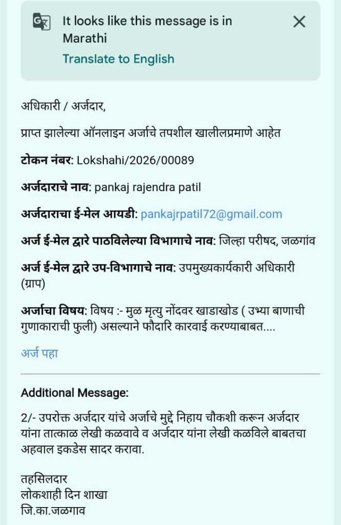 पाचोरा पंचायत समितीतील जन्म-मृत्यू नोंद रेकॉर्डमध्ये खाडाखोड; दोषींवर गुन्हा दाखल करण्याची मागणी सामाजिक कार्यकर्ते पंकज राजेंद्र पाटील तारखेडा खुर्द तालुका पाचोरा जिल्हा जळगाव