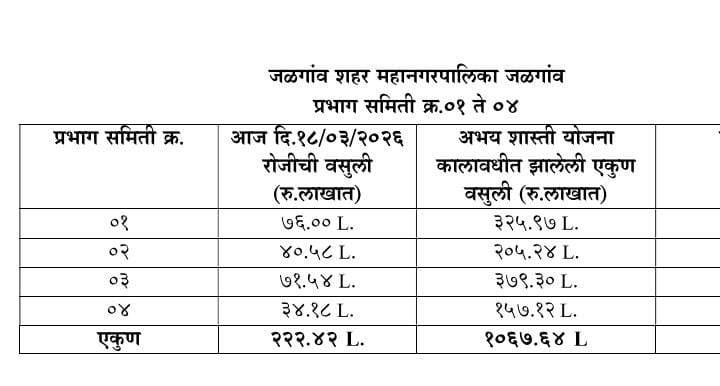 जळगावकरांसाठी शेवटची संधी : पुढील १२ दिवसात मालमत्ता कर भरा, शास्तीत १००% माफी घ्या.!महापौर दीपमाला काळे यांच्या पत्रानंतर प्रशासनाकडून योजनेला शेवटची मुदतवाढ अभय शास्त्री योजनेत झालेली एकूण वसुली गेल्या पंधरा दिवसात 12 कोटी 41 लाख रुपये