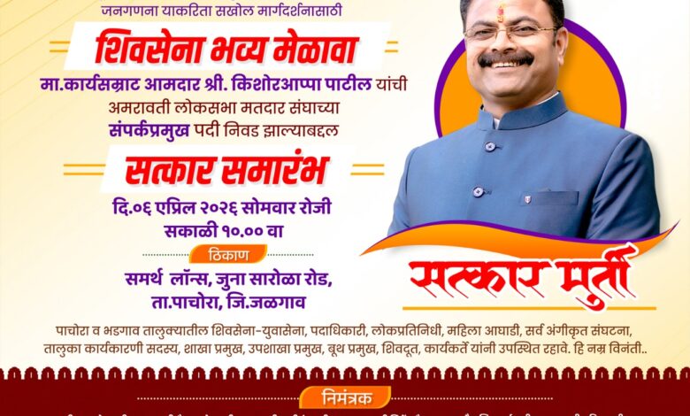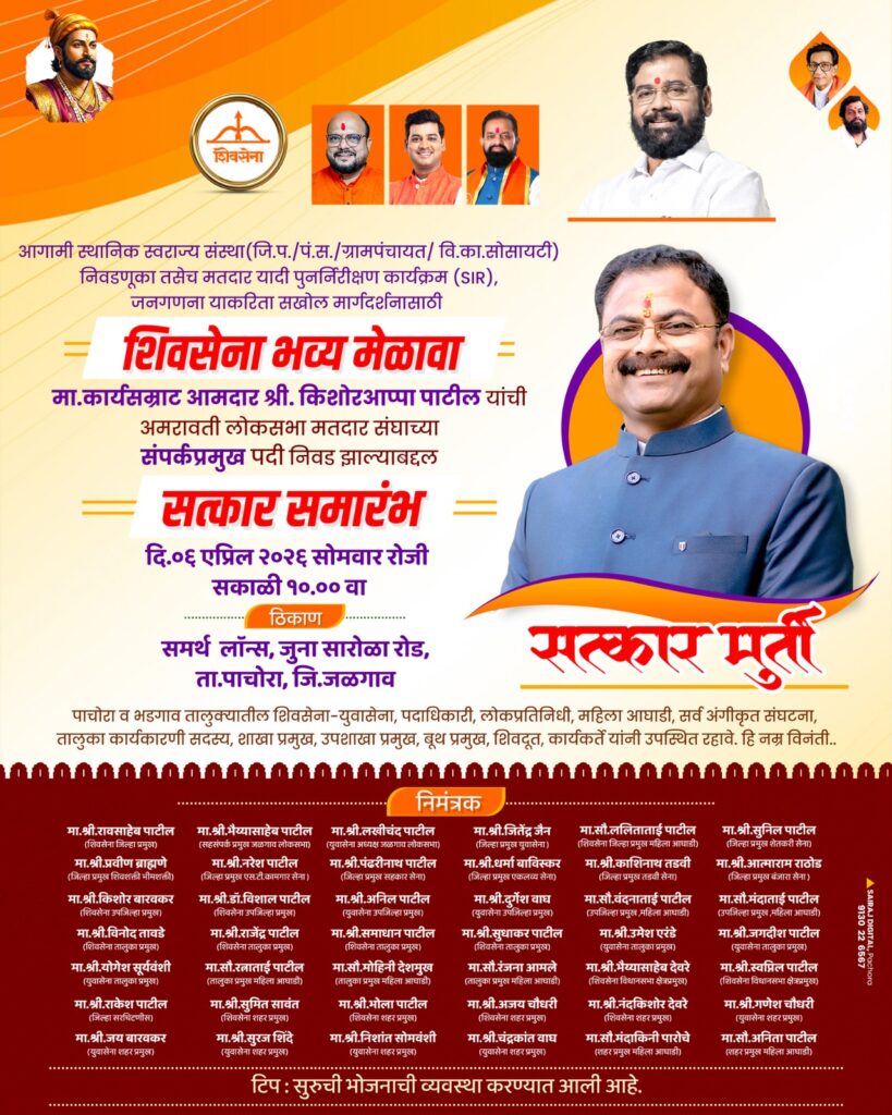 जिल्हा जळगाव तालुका पाचोरा व भडगाव शिवसेना भव्य मेळावा व सत्कार समारंभ!आपल्या सर्वांचे लाडके कार्यसम्राट आमदार श्री किशोर आप्पा पाटील यांची शिवसेना पक्षाच्या वतीने तथा महाराष्ट्र राज्याचे उपमुख्यमंत्री शिवसेनेचे मुख्य नेते *मा.ना.श्री एकनाथरावजी शिंदे साहेब यांच्या आदेशान्वये अमरावती लोकसभा मतदारसंघाच्या संपर्कप्रमुख पदी निवड झाल्याबद्दल सत्कार समारंभ तसेच आगामी स्थानिक स्वराज्य संस्था निवडणुका,मतदान यादी पुर्ननिरीक्षण कार्यक्रम (SIR), जनगणना,याकरीता भव्य मार्गदर्शन मेळावा व सत्कार समारंभ आयोजित करण्यात आला आहे दिनांक ६ एप्रिल २०२६ सोमवार रोजी सकाळी १०.०० वाजता समर्थ लॉन्स,जुना सारोळा रोड,पाचोरा पाचोरा व भडगाव तालुक्यातील शिवसेना युवासेना पदाधिकारी, लोकप्रतिनिधी महिला आघाडी,सर्व अंगिकृत संघटना शाखाप्रमुख उपशाखाप्रमुख, बूथप्रमुख,शिवदुत कार्यकर्ते सर्वांनी मोठ्या संख्येने उपस्थित राहावे ही नम्र विनंती टिप- सुरुची भोजनाची व्यवस्था करण्यात आली आहे शिवालय शिवसेना मध्यवर्ती कार्यालय,पाचोरा