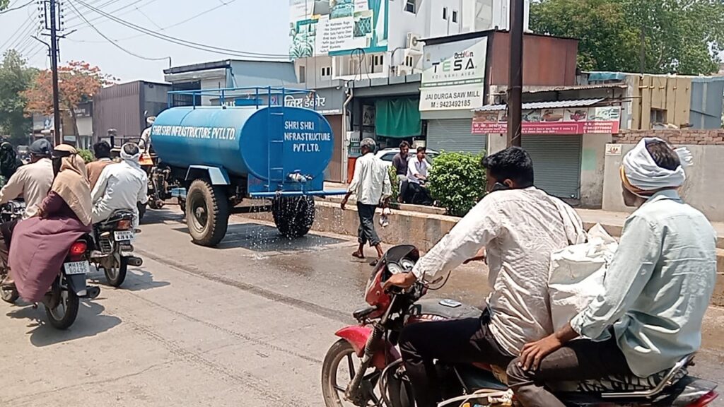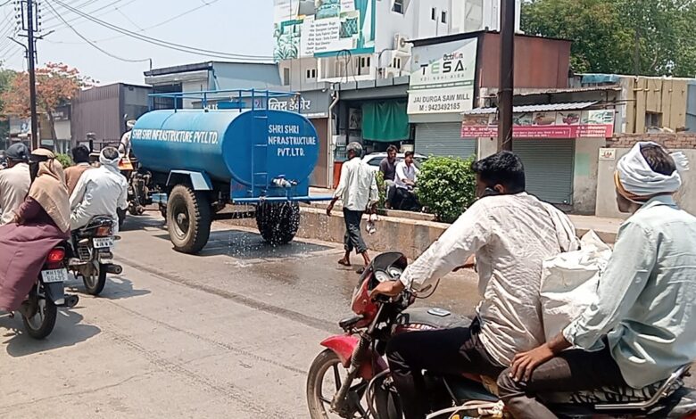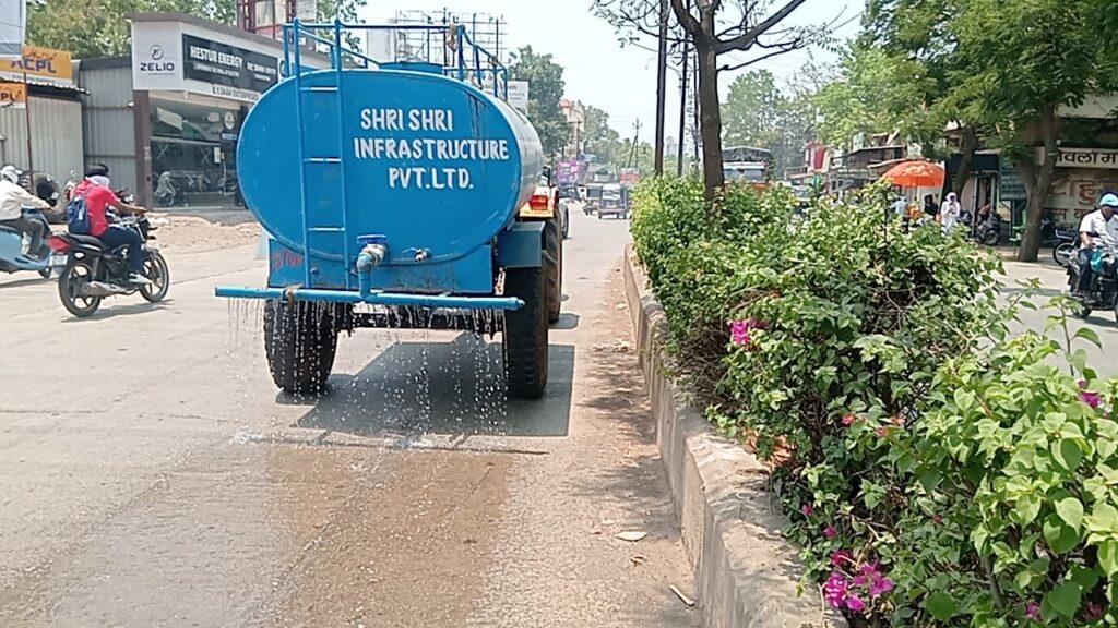 .जळगावच्या चौकांमध्ये ‘वॉटर शॉवर’; वाढत्या उन्हाच्या पाऱ्यामुळे महापालिकेकडून मुख्य रस्त्यांवर पाण्याचे टँकर द्वारा फवारणी रस्त्यावर थंडावा राहण्यासाठी महापौर दीपमाला काळे यांच्या आदेशानंतर तत्परतेणे कार्य सुरू
